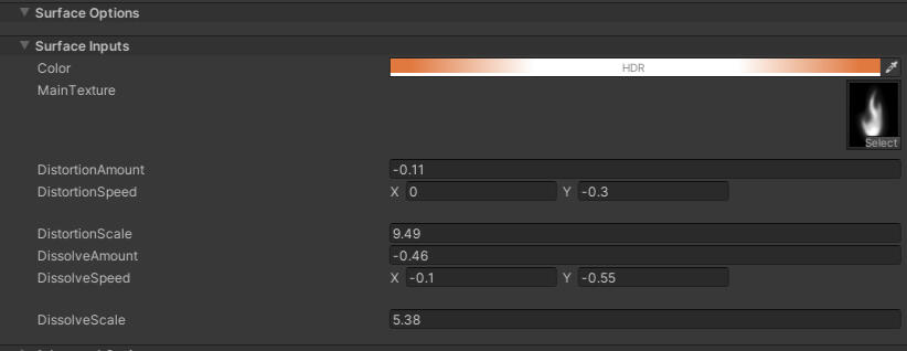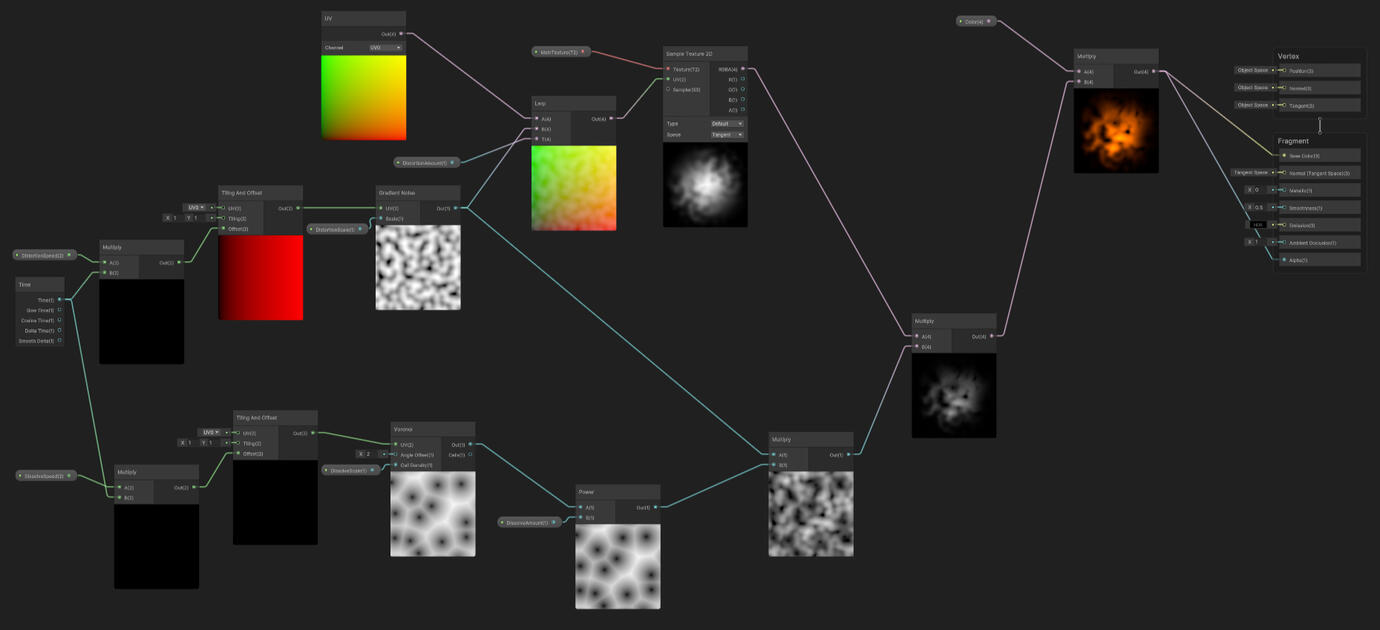 The fireplace houses the friendly fire that helps to keep the foul creatures at bay.The fire effect is done with a simple shader graph which utilizes distortion and dissolving effects based on different noise textures.The parameters of the effect are exposed to the inspector to allow for easy editing .