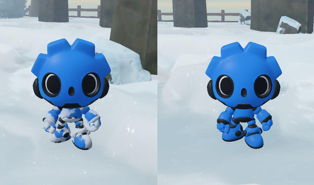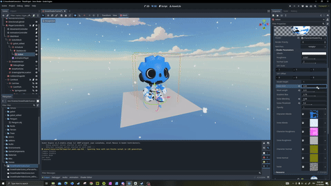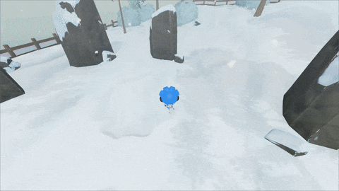 The character also has a custom shader defining the default texture as well as adding the sticking snow on top of the player texture.The snow effect on the player texture is created with an opacity mask defining what parts of the character the snow should appear to. The patches of snow are made with a noise mask using a smoothstep function to define the size and smoothness of the snow.The shader has exposed custom parameters to easily adjust the properties easily. The snow's opacity control receives information from the player controller defining whether the snow on the player should be visible or not.