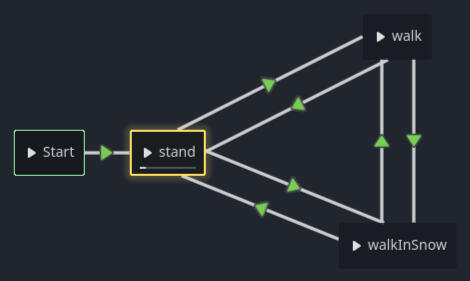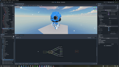 The player controller receives information from the displacement mask and player inputs to define the correct movement state. The controller fetches the opacity value of the pixel in the detector location. If the opacity crosses a certain threshold the movement state is switched.The player controller also communicates with other components like the player camera controller, the movement controller and the character shader. The player movement speed, animation playback speed and other parameters can be adjusted from the player controller making the system easily customisable.The player controller is also easy to edit to allow for additional movement states or features.