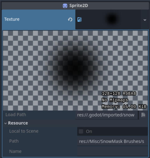 The snow system heavily revolves around a displacement mask created based on the player's path. Multiple components of the system receive information through this texture.The path is drawn through a sub-viewport that places a custom made sprite to the player's location when the player is moving. The viewport texture isn't cleared to ensure that the previous sprites are not erased. The viewport texture or the drawing sprites are not visible in the rendering camera.The opacity of the drawing sprite is adjusted so that all the snow won't be pushed down instanty.