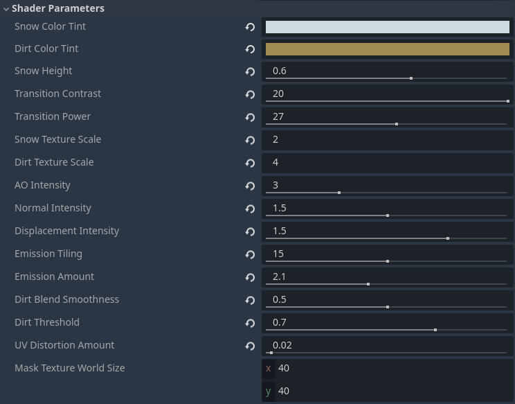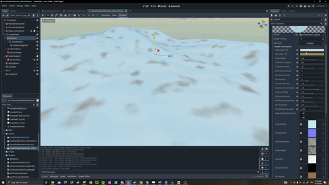 The snow material is divided into two "layers". The surface snow and the snow that appears beneath as the player walks over it. The surface snow works with a PBR material with some adjustable parameters. The bottom layer has the same snow material with a color tint and a dirt blend. This combination allows for more customizability as the amount and blend smoothness of dirt visible can be adjusted.The shader also defines the height and displacement as well as the blend power between the two snow textures based on the exposed parameters.
