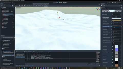The snow shader project was a part of my thesis titled Creating a dynamic snow shader aseet with shader-player interactions: industry pipelines in shader production for the bachelor's degree in game design. It was utilized as a practical demonstration of shader-player interactivity and as a showcase of the result outcomes.Throughout the thesis project I had the opportunity to learn shader programming as I didn't have any prior knowledge in shading languages when starting this project. Additionally, I also started learning Godot while working on the shader. I learned so much about the limitations of shaders and design complexities that often appear in shader production. On top of that, I had to utilize my problem solving skills to overcome all the issues I faced when working with the shader as well as the systems surrouding it.