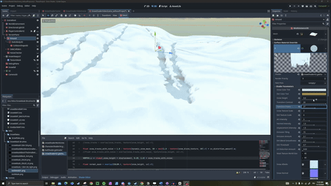 The main functionality of the snow shader is the displacement of the snow based on the player interactions. The snow is displaced in the locations where the player has walked.